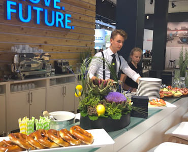 Stefanie Baeskau: „Zum einen ist Professionalität für einen Catering-Service immer unverzichtbar. Besonders wichtig ist sie aber bei einem Messe-Catering, weil die professionelle Arbeitsweise in allen Phasen des Projekts einen nicht zu unterschätzenden Einfluss auf den Geschäftserfolg des Ausstellers hat. Und das gilt nicht nur für das Catering an sich, sondern auch für die Unterhaltung, für Security, Location, Geschirr, Dekoration, Einladungen und alle wesentlichen Abläufe im Messe-Umfeld. Doch es gibt noch eine zweite wichtige Eigenschaft, die ein Caterer mitbringen sollte: die Freude!“